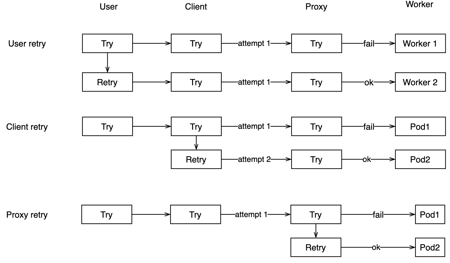 - retry on selected errors at the right level (user vs. client vs. proxy vs. worker)